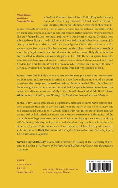 In Soldier's Paradise, Samuel Fury Childs Daly tells the story of how Africa's military dictators tried and failed to transform their societies into martial utopias. Across the continent, independence was followed by a wave of military coups and revolutions. The soldiers who led them had a vision. In Nigeria and other former British colonies, officers governed like they fought battles-to them, politics was war by other means. Civilians were subjected to military-style discipline, which was indistinguishable from tyranny. Soldiers promised law and order, and they saw judges as allies in their mission to make society more like an army. But law was not the disciplinary tool soldiers thought it was. Using legal records, archival documents, and memoirs, Daly shows how law both enabled militarism and worked against it. For Daly, the law is a place to see decolonization's tensions and ironies-independence did not always mean liberty, and freedom had a militaristic streak. In a moment when militarism is again on the rise in Africa, Daly describes not just where it came from but why it lasted so long.
