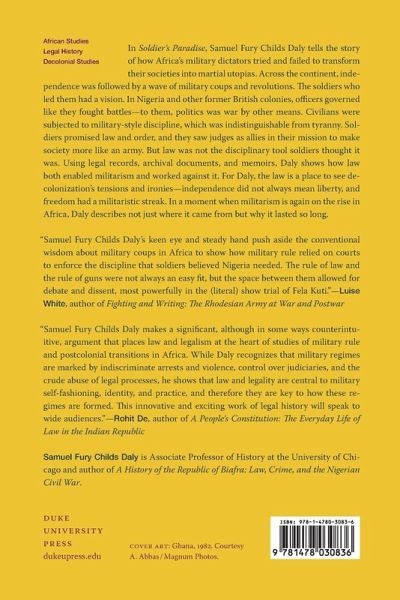 In Soldier's Paradise, Samuel Fury Childs Daly tells the story of how Africa's military dictators tried and failed to transform their societies into martial utopias. Across the continent, independence was followed by a wave of military coups and revolutions. The soldiers who led them had a vision. In Nigeria and other former British colonies, officers governed like they fought battles-to them, politics was war by other means. Civilians were subjected to military-style discipline, which was indistinguishable from tyranny. Soldiers promised law and order, and they saw judges as allies in their mission to make society more like an army. But law was not the disciplinary tool soldiers thought it was. Using legal records, archival documents, and memoirs, Daly shows how law both enabled militarism and worked against it. For Daly, the law is a place to see decolonization's tensions and ironies-independence did not always mean liberty, and freedom had a militaristic streak. In a moment when militarism is again on the rise in Africa, Daly describes not just where it came from but why it lasted so long.