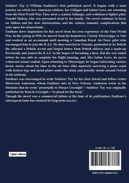 Soldiers¿ Pay is William Faulkner¿s first published novel. It begins with a train journey on which two American soldiers, Joe Gilligan and Julian Lowe, are returning from the First World War. They meet a scarred, lethargic, and withdrawn fighter pilot, Donald Mahon, who was presumed dead by his family. The novel continues to focus on Mahon and his slow deterioration, and the various romantic complications that arise upon his return home. Faulkner drew inspiration for this novel from his own experience of the First World War. In the spring of 1918, he moved from his hometown, Oxford, Mississippi, to Yale and worked as an accountant until meeting a Canadian Royal Air Force pilot who encouraged him to join the R.A.F. He then traveled to Toronto, pretended to be British (he affected a British accent and forged letters from British officers and a made-up Reverend), and joined the R.A.F. in the hopes of becoming a hero. But the war ended before he was able to complete his flight training, and, like Julian Lowe, he never witnessed actual combat. Upon returning to Mississippi, he began fabricating various heroic stories about his time in the air force (like narrowly surviving a plane crash with broken legs and metal plates under the skin), and proudly strode around Oxford in his uniform. Faulkner was encouraged to write Soldiers¿ Pay by his close friend and fellow writer Sherwood Anderson, whom Faulkner met in New Orleans. Anderson wrote in his Memoirs that he went ¿personally to Horace Liveright¿¿Soldiers¿ Pay was originally published by Boni & Liveright¿¿to plead for the book.¿ Though the novel was a commercial failure at the time of its publication, Faulkner¿s subsequent fame has ensured its long-term success.