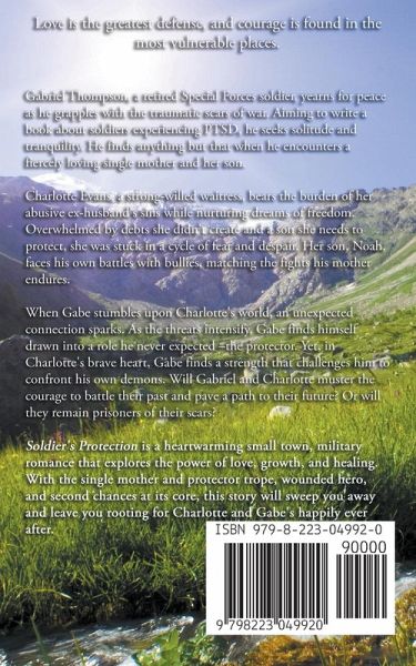 Love is the greatest defense, and courage is found in the most vulnerable places. Gabriel Thompson, a retired Special Forces soldier, yearns for peace as he grapples with the traumatic scars of war. Aiming to write a book about soldiers experiencing PTSD, he seeks solitude and tranquility. He finds anything but that when he encounters a fiercely loving single mother and her son. Charlotte Evans, a strong-willed waitress, bears the burden of her abusive ex-husband's sins while nurturing dreams of freedom. Overwhelmed by debts she didn't create and a son she needs to protect, she was stuck in a cycle of fear and despair. Her son, Noah, faces his own battles with bullies, matching the fights his mother endures. When Gabe stumbles upon Charlotte's world, an unexpected connection sparks. As the threats intensify, Gabe finds himself drawn into a role he never expected –the protector. Yet, in Charlotte's brave heart, Gabe finds a strength that challenges him to confront his own demons. Will Gabriel and Charlotte muster the courage to battle their past and pave a path to their future? Or will they remain prisoners of their scars? Soldier's Protection is a heartwarming small town, military romance that explores the power of love, growth, and healing. With the single mother and protector trope, wounded hero, and second chances at its core, this story will sweep you away and leave you rooting for Charlotte and Gabe's happily ever after.