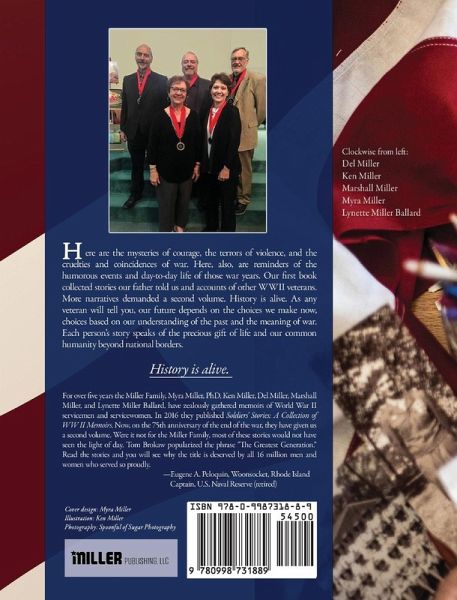 For over five years the Miller Family, Myra Miller, PhD, Ken Miller, Del Miller, Marshall Miller, and Lynette Miller Ballard, have zealously gathered memoirs of World War II servicemen and servicewomen. In 2016 they published Soldiers' Stories: A Collection of WW II Memoirs. Now, on the 75th anniversary of the end of the war, they have given us a second volume. Were it not for the Miller Family, most of these stories would not have seen the light of day. Tom Brokaw popularized the phrase "The Greatest Generation." Read the stories and you will see why the title is deserved by all 16 million men and women who served so proudly. Here are the mysteries of courage, the terrors of violence, and the cruelties and coincidences of war. Here, also, are reminders of the humorous events and day-to-day life of those war years. Our first book collected stories our father told us and accounts of other WWII veterans. More narratives demanded a second volume. History is alive. As any veteran will tell you, our future depends on the choices we make now, choices based on our understanding of the past and the meaning of war. Each person's story speaks of the precious gift of life and our common humanity beyond national borders.