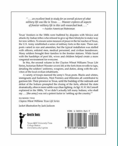 Texas' frontiers in the 1840s were buffeted by disputes with Mexico and attacks by Indian tribes who refused to give up their life-styles to make way for new settlers. To ensure some measure of peace in the far reaches of Texas, the U.S. Army established a series of military forts in the state. These outposts varied in size and amenities, but the typical installation was staffed with officers, enlisted men, medical personnel, and civilian laundresses. Many soldiers brought their families to the frontier stations. While faced with the hardships of post life, wives and children helped create a more congenial environment for all concerned. In this, the second volume in the Clayton Wheat Williams Texas Life Series, historian Robert Wooster covers life at the forts from reveille to taps, detailing the soldiers' uniforms, weapons, and duties, along with the activities of the local civilian inhabitants. As the numerous anecdotes of post residents show, military life on the Texas frontier was not one long battle against Indians or invaders. Many of the daily battles waged were against roaches, cholera, inappropriate government-issue items, harsh weather, and personalities. The presence of women in the forts was considered a healthy and civilizing influence by some; others doubted the morals of the fort's laundresses among lonely enlisted men. Despite the popularity of gambling and drinking, family environments did flourish at many posts: school was taught, dramatic entertainments were performed, religious services were held, and dances were organized to celebrate almost any occasion. A variety of troops manned the army's Texas posts. Blacks and whites, immigrants and Easterners, West Pointers and illiterates all contributed to garrison life. Their presence in Texas until the building of the railroads and defeat of the Indians prompted the closing of the forts affected the state dramatically, often in more subtle ways than fighting. As Sgt. H. H. McConnell explained in the 1880s, "if we didn't actually kill many Indians, who shall say...[the army] was not a potent factor in 'settling up the country.'"