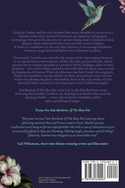 Cordelia Tanner has a fabulous life of fun, frolics, and footwear with her adorable twin brother Rex and their best friend, the dazzling Elodie l'Archambeau. When Cordelia and Rex invent Footloose, an ingenious holographic technology that gives the illusion of a person being shod in fantastical shoe designs when underneath they have on their comfy slippers it leads to a meltdown in the real shoe industry and so the bombastic, vengeful footwear mogul Richard Nailer tries to destroy the culprits. Will the dastardly Nailer succeed in his scheming or will Cordelia triumph? Fortunately, Cordelia can periodically escape all the shenanigans because of an extraordinary extra-sensory ability she calls psychomatricks which permits her to witness episodes in a person's life by holding a piece of their property - very useful when applied to her collection of shoes once owned by luminaries of history. When she discovers the enigmatic Elodie has the ability too they miraculously enter historic realms for adventures galore. This is a funny feel good book with a strong female protagonist set in contemporary London, USA, and Europe in a story about a glamorous family, friendship, jollity and a sprinkling of magic leading to a happy ending. Sole Brethren: If The Shoe Fits is the first in the Sole Brethren series. It is a novel for fans of funny friendship books. Anyone who enjoys imaginative pacy stories with a sense of place and loveable characters in a distinct community will enjoy this book. It has been enjoyed by fans of novelists India Knight, Jilly Cooper, Lewes Carroll, Armistead Maupin, E. F. Benson, Nancy Mitford, and Tom Robbins. Sole Brethren: If The Shoe Fits was included in Shelf Media's 100 Most Notable Independently Published Books 2023.