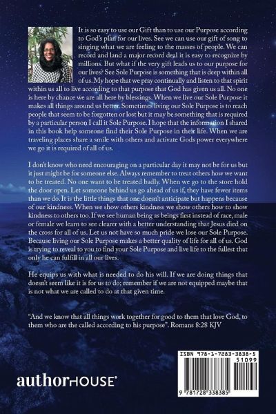 It is so easy to use our Gift than to use our Purpose according to God's plan for our lives. See we can use our gift of song to singing what we are feeling to the masses of people. We can record and land a major record deal it is easy to recognize by millions. But what if the very gift leads us to our purpose for our lives? See Sole Purpose is something that is deep within all of us. My hope that we pray continually and listen to that spirit within us all to live according to that purpose that God has given us all. No one is here by chance we are all here by blessings. When we live our Sole Purpose it makes all things around us better. Sometimes living our Sole Purpose is to reach people that seem to be forgotten or lost but it may be something that is required by a particular person I call it Sole Purpose. I hope that the information I shared in this book help someone find their Sole Purpose in their life. When we are traveling places share a smile with others and activate Gods power everywhere we go it is required of all of us. I don't know who need encouraging on a particular day it may not be for us but it just might be for someone else. Always remember to treat others how we want to be treated. No one want to be treated badly. When we go to the store hold the door open. Let someone behind us go ahead of us if, they have fewer items than we do. It is the little things that one doesn't anticipate but happens because of our kindness. When we show others kindness we show others how to show kindness to others too. If we see human being as beings first instead of race, male or female we learn to see clearer with a better understanding that Jesus died on the cross for all of us. Let us not have so much pride we lose our Sole Purpose. Because living our Sole Purpose makes a better quality of life for all of us. God is trying to reveal to you to find your Sole Purpose and live life to the fullest that only he can fulfill in all our lives. He equips us with what is needed to do his will. If we are doing things that doesn't seem like it is for us to do; remember if we are not equipped maybe that is not what we are called to do at that given time. "And we know that all things work together for good to them that love God, to them who are the called according to his purpose". Romans 8:28 KJV