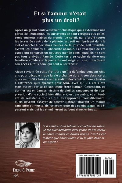 Une passion enflammée et douloureuse dans un monde féroce et cruel où aimer n'est plus un droit... Après un grand bouleversement climatique qui a exterminé une partie de l'humanité, les survivants se sont réfugiés aux pôles, seuls endroits viables du monde. Le soleil, qui a brulé toutes les terres du centre de la planète, est soit omniprésent dans le ciel et mortel à certaines heures de la journée, soit invisible, livrant les hommes à l'obscurité absolue. Les rescapés de cet exode ont construit un nouveau monde dans lequel ils ne sont pas tous arrivés: Pangée. >Aidan revient de cette frontière qu'il a défendue pendant cinq ans pour découvrir que la vie a changé durant son absence et que ceux qu'il a laissés ont grandi. Il devra lutter pour résister à l'attirance qu'il éprouve pour Nina, avec qui il a été élevé mais qui est éprise de son jeune frère Nathan. Cependant, ce dernier est en danger, victime de vieilles rancunes et de l'oppression d'une société inégalitaire. C'est ensemble, et en tentant de résister à tout ce qui les rapproche irrésistiblement, qu'ils devront essayer de sauver Nathan. >SOLEIL BLANC est avant tout une histoire d'amour. Amour fraternel au coeur des rancunes familiales. Amour interdit par les liens du sang ou des lois d'une société inégalitaire qui ne reconnaît que l'union des êtres de même naissance et qui interdit l'homosexualité. Et, c'est dans cette tyrannie que vont se déchaîner les passions de tous ceux qui n'ont pas le droit de s'aimer. SOLEIL BLANC est aussi l'histoire d'hommes et de femmes qui devront lutter pour être libres de leurs choix, de leur identité et de leur droit à décider de leur avenir. Ce livre est un mélange de passion, de haine et d'amour, dans un monde hostile et féroce.