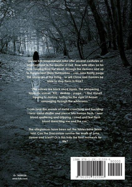 Lianne has reawakened John after several centuries of imprisonment in the depths of Hell. Now with powerful allies on his side ranging from the dead, through the demons and up to the ancient Titans themselves... can John finally purge the universes of the living... or will Chloe and Damien be able to stop him in time? "The voices are back once again. The whispering hypnotic voices: "Kill... destroy... purge..." I find myself longing to destroy, lusting for the sight of flames rampaging through the wilderness." "I can hear the sounds of metal crunching and buckling. I hear metal shatter and pierce into human flesh. I hear blood spattering and dropping. I smell and feel fresh blood drenching me and the car." The allegiances have been set, the tables have been laid. Can the Draconians survive the wrath of John, Lianne and Iciest... or is this truly the final moments for life?