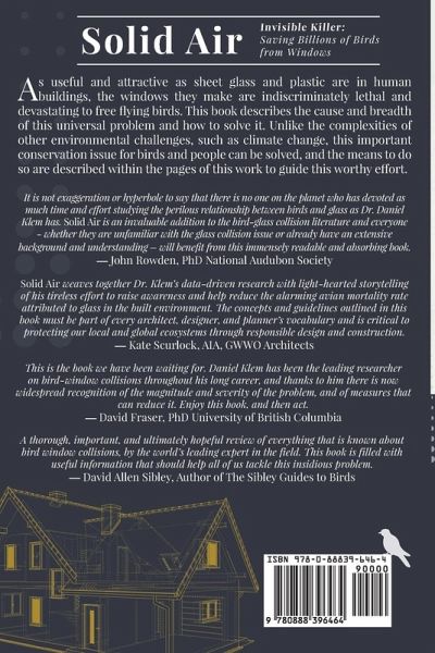 Birds behave as if sheet glass is invisible to them. They kill themselves striking clear and reflective panes in all types and sizes of human-built structures the world over. The killing is indiscriminate, taking the fit and unfit species, of any age category- both common and of conservation concern. Window-kills occur in the billions worldwide annually. The victims are always unintended, unnecessary, harmless, and have no voice or other means to protect themselves. The science documenting this significant scale of loss has been known for decades, but only recently have meaningful efforts to address the problem occurred. Here, Dr. Daniel Klem, Jr., describes and summarizes the challenges and solutions to this important conservation issue for birds and people that can be used by, among others, architects and developers, legislators, legal professionals, urban planners, and homeowners alike. Unlike the complexities of other environmental challenges, such as climate change, this important conservation issue for birds and people can be solved, and the means to do so are described within the pages of this work to guide this worthy effort. The author's 44 years of scientific research have revealed answers to create proven bird-safe products for sale. This book ultimately tries to make the case that such a commitment is worthwhile and needed.