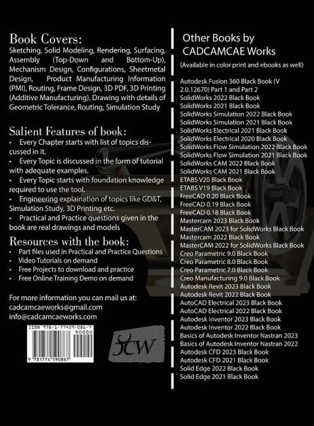 The Solid Edge 2023 Black Book is the new and updated 4th edition of our series on Solid Edge. This book is written to help beginners in creating some of the most complex solid models. The book follows a step-by-step methodology. In this book, we have tried to give real-world examples with real challenges in designing. We have tried to reduce the gap between university use of Solid Edge and industrial use of Solid Edge. The book covers almost all the information required by a learner to master the Solid Edge. The book starts with sketching and ends at advanced topics like Sheetmetal, Rendering, and Simulation Studies. Some of the salient features of this book are: In-Depth explanation of concepts Every new topic of this book starts with the explanation of the basic concepts. In this way, the user becomes capable of relating the things with real world. Topics Covered Every chapter starts with a list of topics being covered in that chapter. In this way, the user can easily find the topics of his/her interest easily. Instruction through illustration The instructions to perform any action are provided by maximum number of illustrations so that the user can perform the actions discussed in the book easily and effectively. There are about 1500 illustrations that make the learning process effective. Tutorial point of view At the end of concept's explanation, the tutorial makes the understanding of users firm and long lasting. Almost each chapter of the book has tutorials that are real world projects. Moreover, most of the tools in this book are discussed in the form of tutorials. Project Projects and exercises are provided to students for practicing. For Faculty If you are a faculty member, then you can ask for video tutorials on any of the topic, exercise, tutorial, or concept. As faculty, you can register on our website to get electronic desk copies of our latest books, self-assessment, and solution of practical. Faculty resources are available in the Faculty Member page of our website (www.cadcamcaeworks.com) once you login. Note that faculty registration approval is manual and it may take two days for approval before you can access the faculty website.