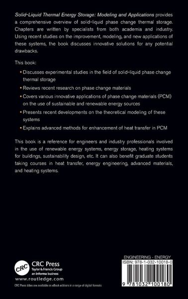 Solid-Liquid Thermal Energy Storage: Modeling and Applications provides a comprehensive overview of solid-liquid phase change thermal storage. Chapters are written by specialists from both academia and industry. Using recent studies on the improvement, modeling, and new applications of these systems, the book discusses innovative solutions for any potential drawbacks. This book: Discusses experimental studies in the field of solid-liquid phase change thermal storage Reviews recent research on phase change materials Covers various innovative applications of phase change materials (PCM) on the use of sustainable and renewable energy sources Presents recent developments on the theoretical modeling of these systems Explains advanced methods for enhancement of heat transfer in PCM This book is a reference for engineers and industry professionals involved in the use of renewable energy systems, energy storage, heating systems for buildings, sustainability design, etc. It can also benefit graduate students taking courses in heat transfer, energy engineering, advanced materials, and heating systems.
