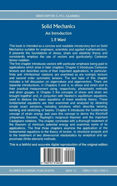 1 Vectors.- 1.1 Introduction to vector algebra.- 1.2 The scalar product.- 1.3 The vector product.- 1.4 Applications of vectors to forces.- 1.5 Triple products.- 1.6 The index notation for vectors.- 1.7 Vector differential calculus.- 1.8 Vector integral calculus.- 2 Cartesian Tensors.- 2.1 Introduction.- 2.2 Rotation of Cartesian coordinates.- 2.3 Cartesian tensors.- 2.4 Properties of tensors.- 2.5 The rotation tensor.- 2.6 Isotropic tensors.- 2.7 Second order symmetric tensors.- 3 The Analysis of Stress.- 3.1 Introduction.- 3.2 The stress tensor.- 3.3 Principal axes.- 3.4 Maximum normal and shear stresses.- 3.5 Plane stress.- 3.6 Photoelastic measurement of principal stresses.- 4 The Analysis of Strain.- 4.1 The strain tensor.- 4.2 Physical interpretation of the strain tensor.- 4.3 Principal axes, principal strains.- 4.4 Principal strains and the strain rosette.- 4.5 The compatibility equations for strain.- 5 Linear Elasticity.- 5.1 Hooke's law and the simple tension experiment.- 5.2 The governing equations of linear eleasticity.- 5.3 Simple solutions.- 5.4 The Navier equation in linear elasticity.- 6 Energy.- 6.1 Strain energy and work.- 6.2 Kirchoff's uniqueness theorem.- 6.3 The reciprocal theorem.- 6.4 The Castigliano theorem.- 6.5 Potential energy.- 7 The General Torsion Problem.- 7.1 Introduction.- 7.2 The torsion function.- 7.3 Shearing stress in the torsion problem.- 7.4 Simple exact solutions in the torsion problem.- 7.5 Approximate formulae in the torsion problem.- 8 The Matrix Analysis of Structures.- 8.1 Introduction.- 8.2 Pin-jointed elements.- 8.3 Two and three dimensional pin-jointed structures.- 8.4 Beam elements.- 8.5 Equivalent nodal forces.- 9 Two Dimensional Elastostatics.- 9.1 Plane strain, plane stress and generalised plane stress.- 9.2 Exactsolutions to problems in plane strain.- 9.3 Approximations in two dimensional elastostatics.- Appendix 1 The Variational Calculus.- A1.1 The fundamental lemma.- A1.2 Functionals and the variational calculus.- A1.3 Construction of functionals.- A1.4 One dimensional fourth-order problems.- A1.5 Variational formulation of fourth-order problems.- References.