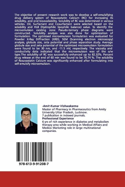The objective of present research work was to develop a self-emulsifying drug delivery system of Rosuvastatin Calcium (RC) for increasing its solubility, and oral bioavailability. Solubility of RC was determined in various vehicles. Oil, Surfactant and Cosurfactant were selected based on the solubility and HLB (Hydrophilic lipophilic balance) value. To identify the microemulsion existing zone Pseudo-ternary phase diagrams were constructed. Solubility analysis was also done for optimization of formulation. The optimised microemulsion formulation was evaluated for Powder X-Ray Diffraction (XRD), SEM (Scanning electron microscopy) analysis, globule size, zeta potential and phase separation study. Average globule size and zeta potential of the optimized microemulsion formulation were found to be 30 nm, and -11.5 mV, respectively. The viscosity and conductivity data indicated that the microemulsion was of the o/w type.The solubility of RC was successfully enhanced up to 82.32%. Percent drug release at the end of 60 min was found to be 76.74 %. The solubility of Rosuvastatin Calcium was significantly enhanced after formulating into self-emulsify microemulsion.