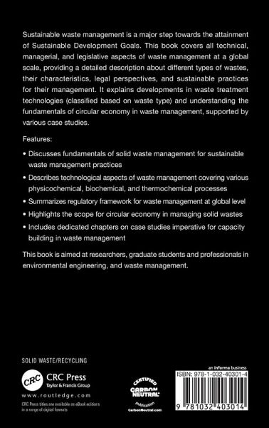 Sustainable waste management is a major step towards the attainment of Sustainable Development Goals. This book covers all technical, managerial, and legislative aspects of waste management at a global scale, providing a detailed description about different types of wastes, their characteristics, legal perspectives, and sustainable practices for their management. It explains developments in waste treatment technologies (classified based on waste type) and understanding the fundamentals of circular economy in waste management, supported by various case studies.