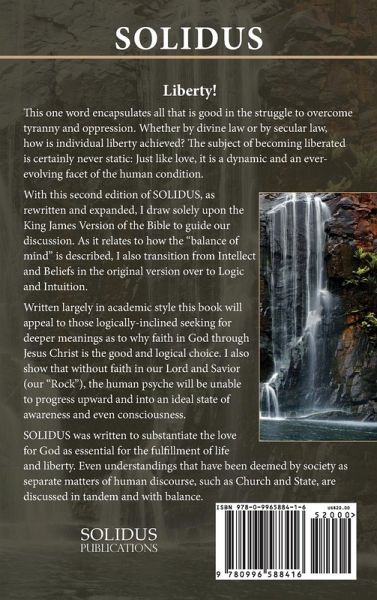 Science finds that the reasoning process involving the left brain of humans is objectively driven, while the right brain is subjectively driven. While keeping this in mind, as aspects of Sigmund Freud's model of the human psyche are discussed in relation to the fullness of Biblical Truth, an insightful look about the relationship between thought and behavior can be explored. SOLIDUS illustrates how the pinnacle for human understanding can only be achieved by the arisen state – that is, the arisen state of mind. The process for arising as such is long-term and cannot be achieved without the grace of God. As the result of one’s response in faith, God-consciousness is attained, and so is liberty. With the second edition of SOLIDUS, as rewritten and expanded, I draw solely upon the King James Version of the Bible to guide our discussion. As it relates to how the "balance of mind" is described, I also transition from Intellect and Beliefs in the original version over to Logic and Intuition. Written largely in academic style this book will appeal to those logically-inclined seeking for deeper meanings as to why faith in God through Jesus Christ is the good and logical choice. Even understandings that have been deemed by society as separate matters of human discourse, such as Church and State, are discussed in tandem and with balance.