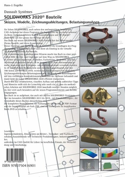SOLIDWORKS 2020BauteileISBN 9783750416901Sie lieben SOLIDWORKS, auch neben den umfangreichen, beruflichen, CAD-Aufgaben hat dieses Programm die Faszination für Sie nicht verloren?Zu Ihren Aufgaben gehören Bauteil-Konstruktionen und 3D-Drucke?Dann habe ich hier genau das Richtige für Sie!Das Buch zur neuen SOLIDWORKS 2020-Version hat das Schwerpunkt-Thema Bauteile und deren Konstruktion.Dieses Training- und Nachschlagewerk behandelt die Grundlagen des Programmpakets SOLIDWORKS 2020 und dient als Einstieg in die virtuelle 3D-Konstruktionswelt für Bauteile.Die Vermittlung des grundlegenden Wissens macht das Buch zu einer wertvollen Hilfe für Ein- und Umsteiger auf dem Weg zu SOLIDWORKS.Es richtet sich an Ingenieure, Techniker, Facharbeiter, Studenten, und Auszubildende technischer Berufe, es ist in erster Linie zum Alleinstudium gedacht, kann aber auch schulungs- und studienbegleitend verwendet werden.In elf ausführlichen Buchkapiteln und vierzehn Supportkapitel, mit fast 700 Seitenauf der Buch-DVD, werden das Zusammenspiel von Bauteilen, Zeichnungsableitungen Belastungsanalysen, 3D-Druck und Bauteilimporte mit den vielfältigen Konstruktionsmöglichkeiten der Software behandelt und damit lernt der Leser SOLIDWORKS 2020 effizient einzusetzen.Durch den klar strukturierten, visuellen Aufbau und mittels zahlreicher Tipps und Hinweise stellt sich der Lernerfolg sehr rasch ein, so dass ein methodisches Arbeiten mit SOLIDWORKS 2020 innerhalb weniger Stunden möglich ist, hier wird auch besonders auf die neuen Programmelemente und Befehle eingegangen. Das Buch ist so aufgebaut, das auch mit älteren SOLIDWORKS-Versionen, hier ins besonders SOLIDWORKS 2015 bis 2019, -mit Einschränkungen-, die Lerninhalte dieses Buches abzuarbeiten sind.Die kompletten Bauteildateien, die Farbausgabe des Buches im PDF-Format und die Supportkapitel als Farb-PDF, sind auf einer, gratis zu bestellenden Buch-DVD zu erhalten.