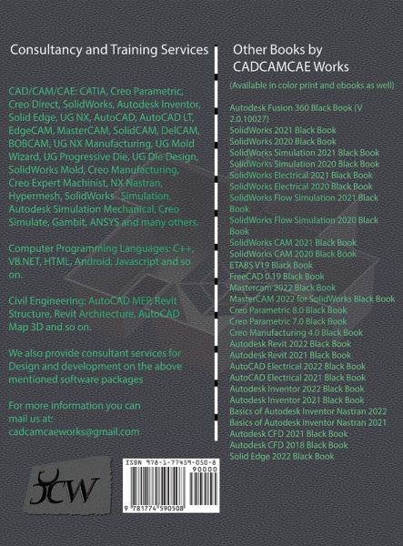 The SolidWorks 2022 Black Book (Colored) is the 9th edition of our series on SolidWorks. With lots of additions and thorough review, we present a book to help professionals as well as learners in creating some of the most complex solid models. The book follows a step by step methodology. In this book, we have tried to give real-world examples with real challenges in designing. We have tried to reduce the gap between university use of SolidWorks and industrial use of SolidWorks. In this edition of book, we have included many new features of SolidWorks as per the latest enhancements of software. The book covers almost all the information required by a learner to master the SolidWorks. The book starts with sketching and ends at advanced topics like Mold Design, Sheetmetal, Weldment, SolidWorks CAM, Rendering, and MBD. Some of the salient features of this book are : In-Depth explanation of concepts Every new topic of this book starts with the explanation of the basic concepts. In this way, the user becomes capable of relating the things with real world. Topics Covered Every chapter starts with a list of topics being covered in that chapter. In this way, the user can easy find the topic of his/her interest easily. Instruction through illustration The instructions to perform any action are provided by maximum number of illustrations so that the user can perform the actions discussed in the book easily and effectively. There are about 1350 illustrations that make the learning process effective. Tutorial point of view At the end of concept's explanation, the tutorial make the understanding of users firm and long lasting. Almost each chapter of the book has tutorials that are real world projects. Moreover most of the tools in this book are discussed in the form of tutorials. Project Free projects and exercises are provided to students for practicing. For Faculty If you are a faculty member, then you can ask for video tutorials on any of the topic, exercise, tutorial, or concept. As faculty, you can register on our website to get electronic desk copies of our latest books, self-assessment, and solution of practical. Faculty resources are available in the Faculty Member page of our website once you login. Note that faculty registration approval is manual and it may take two days for approval before you can access the faculty website. New Addition If anything is added in this edition but is not available in the previous editions, then it is displayed with symbol New in table of content.
