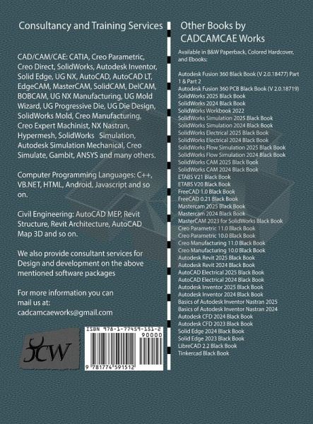The SolidWorks 2025 Black Book is the 12th edition of our series on SolidWorks. With lots of additions and thorough review, we present a book to help professionals as well as beginners in creating some of the most complex solid models. The book follows a step by step methodology. In this book, we have tried to give real-world examples with real challenges in designing. We have tried to bridge the gap between academic use and industrial use of SolidWorks. In this edition of book, we have included many new features of SolidWorks as per the latest enhancements of software. The book covers almost all the information required by a learner to master the SolidWorks. The book starts with sketching and ends at advanced topics like Mold Design, Sheetmetal, Weldment, SolidWorks CAM, and MBD. Some of the salient features of this book are : In-Depth explanation of concepts Every new topic of this book starts with the explanation of the basic concepts. In this way, the user becomes capable of relating the things with real world. Topics Covered Every chapter starts with a list of topics being covered in that chapter. In this way, the user can easy find the topic of his/her interest easily. Instruction through illustration The instructions to perform any action are provided by maximum number of illustrations so that the user can perform the actions discussed in the book easily and effectively. There are about 1300 illustrations that make the learning process effective. Tutorial point of view At the end of concept's explanation, the tutorial make the understanding of users firm and long lasting. Almost each chapter of the book has tutorials that are real world projects. Moreover most of the tools in this book are discussed in the form of tutorials. Self-Assessment The book has more than 500 MCQs for self-assessment by learner. For Faculty If you are a faculty member, then you can ask for video tutorials on any of the topic, exercise, tutorial, or concept. As faculty, you can register on our website to get electronic desk copies of our latest books, self-assessment, and solution of practical. Faculty resources are available in the Faculty Member page of our website once you login. Note that faculty registration approval is manual and it may take two days for approval before you can access the faculty website.