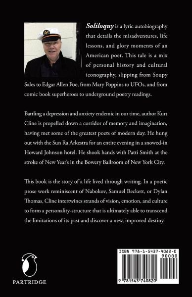 Soliloquy is a lyric autobiography that details the misadventures, life lessons, and glory moments of an American poet. This tale is a mix of personal history and cultural iconography, slipping from Soupy Sales to Edgar Allen Poe, from Mary Poppins to UFOs, and from comic book superheroes to underground poetry readings. Battling a depression and anxiety endemic in our time, author Kurt Cline is propelled down a corridor of memory and imagination, having met some of the greatest poets of modern day. He hung out with the Sun Ra Arkestra for an entire evening in a snowed-in Howard Johnson hotel. He shook hands with Patti Smith at the stroke of New Year's in the Bowery Ballroom of New York City. This book is the story of a life lived through writing. In a poetic prose work reminiscent of Nabokov, Samuel Beckett, or Dylan Thomas, Cline intertwines strands of vision, emotion, and culture to form a personality-structure that is ultimately able to transcend the limitations of its past and discover a new, improved destiny.