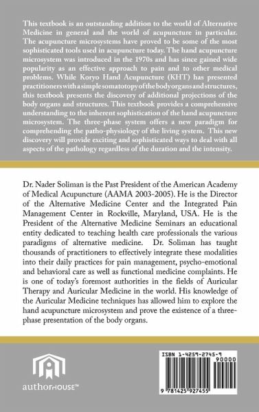 This textbook is an outstanding addition to the world of Alternative Medicine in general and the world of acupuncture in particular. The acupuncture Microsystems have proven to be some of the most sophisticated tools used in acupuncture today. The hand acupuncture microsystem was introduced in the 1970s and has since gained wide popularity as an effective approach to pain and to other medical problems. While Koryo Hand Acupuncture (KHT) has presented practitioners with a simple somatotopy of the body organs and structures, this textbook presents the discovery of additional projections of the body organs and structures. This textbook provides a comprehensive comprehension to the inherit sophistication of the hand acupuncture microsystem. The three-phase system offers a new paradigm for understanding the patho-physiology of the living system. This new discovery will provide exciting and sophisticated ways to deal with all aspects of the pathology regardless of the duration and the intensity.