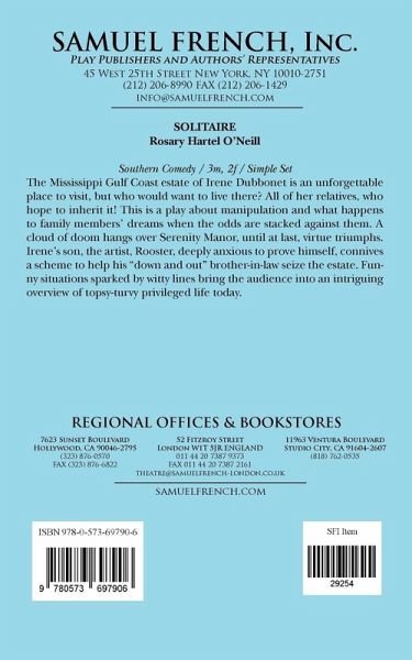 Full Length, Southern Comedy Characters: 3 male, 2 female Interior The Mississippi Gulf Coast estate of Irene Dubbonet is an unforgetable place to visit, but who would want to live there? All of her relatives, who hope to inherit it! This is a play about manipulation and what happens to family members' dreams when the odds are stacked against them. A cloud of doom hangs over Serenity Manor, until at last, virtue triumphs. Irene's son, the artist, Rooster, deeply anxious to prove himself, connives a scheme to help his "down and out" brother-in-law seize the estate. Funny situations sparked by witty lines bring the audience into an intriguing overview of topsy-turvy privileged life today. Also available in A Louisiana Gentleman and other New Orleans Comedies.