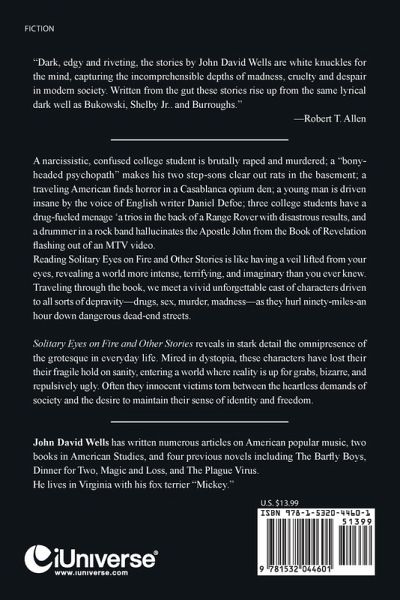 "Dark, edgy and riveting, the stories by John David Wells are white knuckles for the mind, capturing the incomprehensible depths of madness, cruelty and despair in modern society. Written from the gut these stories rise up from the same lyrical dark well as Bukowski, Shelby Jr.. and Burroughs." -Robert T. Allen A narcissistic, confused college student is brutally raped and murdered; a "bony-headed psychopath" makes his two step-sons clear out rats in the basement; a traveling American finds horror in a Casablanca opium den; a young man is driven insane by the voice of English writer Daniel Defoe; three college students have a drug-fueled menage 'a trios in the back of a Range Rover with disastrous results, and a drummer in a rock band hallucinates the Apostle John from the Book of Revelation flashing out of an MTV video. Reading Solitary Eyes on Fire and Other Stories is like having a veil lifted from your eyes, revealing a world more intense, terrifying, and imaginary than you ever knew. Traveling through the book, we meet a vivid unforgettable cast of characters driven to all sorts of depravity-drugs, sex, murder, madness-as they hurl ninety-miles-an hour down dangerous dead-end streets. Solitary Eyes on Fire and Other Stories reveals in stark detail the omnipresence of the grotesque in everyday life. Mired in dystopia, these characters have lost their their fragile hold on sanity, entering a world where reality is up for grabs, bizarre, and repulsively ugly. Often they innocent victims torn between the heartless demands of society and the desire to maintain their sense of identity and freedom.