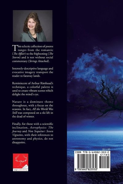This eclectic collection of poems ranges from the romantic (The Affair) to the frightening (The Storm) and is not without social commentary (Strings Attached). Intensely-descriptive language and evocative imagery transport the reader to faraway lands. Reminiscent of Arthur Rimbaud’s technique, a colorful palette is used to create vibrant scenes which delight the mind’s eye. Nature is a dominate theme throughout, with a focus on the seasons. In fact, All the World Was Still was composed on a ski lift in the dead of winter. Finally, for those with a scientific inclination, Astrophysics: The Journey and Non Sequitur: Seven Vignettes, with their references to astronomy and physics, do not disappoint.