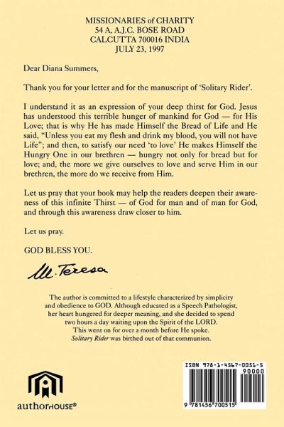 Solitary Rider is a directly inspired journey into a deep intimacy with Jesus Christ and ultimately union with God. It miraculously evolved out of several years of anointed prayer sessions with Jesus and communion with our heavenly Father. During these precious hours Diana would be given spiritual experiences with the Lord which she had the grace to record in the form of prophetic words, poetry, and prose. These ultimately came together to tell a story. The author had no idea that she had been commissioned to write a book until one day while preparing to go out God said, "You will be writing a book called 'Solitary Rider.' " She felt that was impossible, and it was not even a Christian title! Several days hence, however, the title poem was inspired by the Holy Spirit, and she began to believe this writing could actually be established by Him in book form. As the writings from her notebook were being typed, God whispered "Christian Classic" to the author which have been words used to describe this powerful work by numerous people including publishers. It is given a five star rating on Amazon.com., and one reader writes, "No seeker of Jesus Christ should be without this book. It is the most heart-touching I have ever read. A Christian classic." It guides the reader through the entire Christian experience from salvation through childhood, adulthood or maturity, and unto completion. The style although profound is simple and very readable. Many claim that the touch of God upon the words makes them weep. It is a book that can be read once or twice and then kept near you to be used as a devotional. Diana wanted the manuscript to be sent to Mother Teresa of Calcutta. It arrived and was read by this beloved saint just before she went home to be with the Lord. Her personal letter to the author appears of the back cover of the book. We know of no other book that has ever been acknowledged by Mother Teresa. Solitary Rider was approved by the American Association of Libraries for Bible Colleges and Seminaries as entirely scripturally accurate. The book is laced with passages from the Word of God as one journeys through.