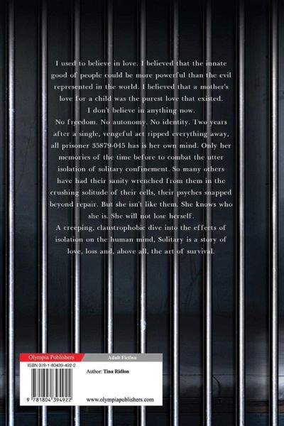I used to believe in love. I believed that the innate good of people could be more powerful than the evil represented in the world. I believed that a mother's love for a child was the purest love that existed. I don't believe in anything now. No freedom. No autonomy. No identity. Two years after a single, vengeful act ripped everything away, all prisoner 35879-045 has is her own mind. Only her memories of the time before to combat the utter isolation of solitary confinement. So many others have had their sanity wrenched from them in the crushing solitude of their cells, their psyches snapped beyond repair. But she isn't like them. She knows who she is. She will not lose herself. A creeping, claustrophobic dive into the effects of isolation on the human mind, Solitary is a story of love, loss and, above all, the art of survival.