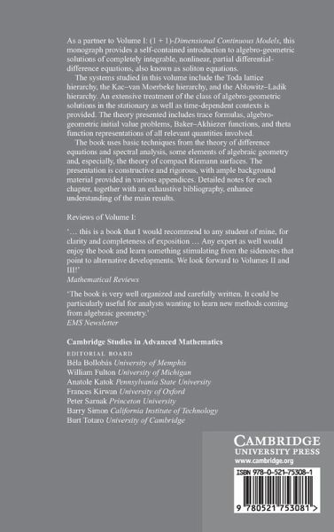 As a partner to Volume 1: Dimensional Continuous Models, this monograph provides a self-contained introduction to algebro-geometric solutions of completely integrable, nonlinear, partial differential-difference equations, also known as soliton equations. The systems studied in this volume include the Toda lattice hierarchy, the Kac-van Moerbeke hierarchy, and the Ablowitz-Ladik hierarchy. An extensive treatment of the class of algebro-geometric solutions in the stationary as well as time-dependent contexts is provided. The theory presented includes trace formulas, algebro-geometric initial value problems, Baker-Akhiezer functions, and theta function representations of all relevant quantities involved. The book uses basic techniques from the theory of difference equations and spectral analysis, some elements of algebraic geometry and especially, the theory of compact Riemann surfaces. The presentation is constructive and rigorous, with ample background material provided in various appendices. Detailed notes for each chapter, together with an exhaustive bibliography, enhance understanding of the main results.