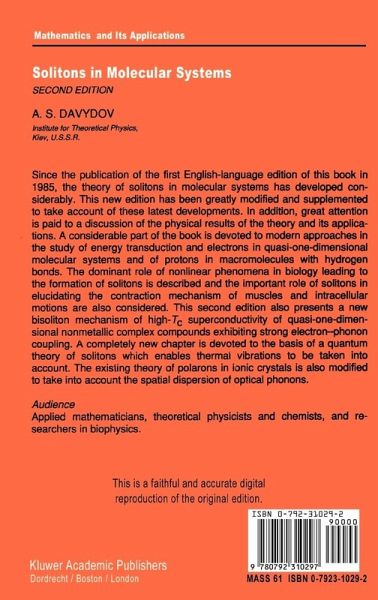 1. Collective Excitations in Quasi-Periodical Molecular Structures.- 1. Crisis in Bioenergetics.- 2. Alpha-Helical Structure of Proteins.- 3. Collective Excitations in a Single Chain of Peptide Groups.- 4. Excitons in Molecular a Chain.- 5. Solitons in Molecular a Chain.- 6. Solitons in Real ?-Helical Molecules.- 2. Some Phenomena with Participation of Molecular Solitons.- 7. Solitons and Molecular Mechanism for Muscle Contraction.- 8. Solitons and the Molecular Mechanism of the Effect of Radiation on Cells.- 9. A Possible Mechanism for General Anesthesia.- 10. Intracellular Dynamics and Solitons.- 3. Excitation of Solitons in One-Dimensional Systems.- 11. Time-Dependent Evolution of Initial Excitation.- 12. Initial Excitation in the Form of a Hyperbolic Secant.- 13. Initial Excitation in the Form of a Rectangular Impulse.- 4. Dynamical Properties of Solitons.- 14. Free Solitons.- 15. Soliton Motion with Friction.- 16. Soliton Motion Affected by External Inhomogeneous Fields.- 5. Solitons in Molecular Systems with Nonlinear Intermolecular Interactions.- 17. The Equation of Soliton Motion for General Intermolecular Interaction.- 18. Cubic Anharmonicity.- 19. Quartic Anharmonicity.- 20. Repulsive Core Potential.- 6. Super-Sound Acoustic Solitons.- 21. Solitons in Toda Nonlinear Lattices.- 22. Acoustic Solitons in Molecular Chain with Cubic Anharmonicity.- 23. Acoustic Solitons in Molecular Chain with Quartic Anharmonicity.- 24. The Capture of an Excess Electron by Supersound Acoustic Solitons.- 25. Supersound Solitons in Nonlinear Quasi-One-Dimensional Molecular Structures.- 7 The Theory of Electron Transfer by Solitons.- 26. The Donor-Acceptor Model of Electron Transfer by Protein Molecules.- 27. The Interaction of an Electron with Nondipole Optical Phonons.- 8Space-Periodic Excitations in Nonlinear Systems.- 28. Mobile Periodical Excitations in One-Dimensional Systems.- 29. Elementary Data on Jacobian Elliptic Functions.- 30. Periodic Solutions of the Nonlinear Schrödinger Equation. Cnoidal Waves.- 31. Periodic Solutions for Some Quasiparticles in a Quasi-One-Dimensional Molecular Chain.- 32. Autolocalized Periodic Thickening of Particles Described by a Complex Field with Inertialess Self-Interaction.- 9 The Quantum Theory of Quasiparticle Motion in a Molecular Chain Taking into Account Thermal Vibrations.- 33. Equations for the Stationary States of a Quasiparticle in a One-Dimensional Chain within a Thermostat.- 34. Nonlocalized Stationary States of a Quasiparticle.- 35. Smooth Autolocalized State-Single Soliton.- 36. Solutions Describing the Movement of Periodically Arranged Quasiparticles.- 37. Strong Quasiparticle Autolocalization.- 38. Radiation Excitation of Optical Solitons in Crystalline Acetanilide.- 10 The Nonlinear Sine-Gordon Equation.- 39. Canonic Form of the Sine-Gordon Equation.- 40. Single-Phase Solutions of the Sine-Gordon Equation.- 41. The Solution of the Sine-Gordon Equation by the Method of Separation of Variables.- 42. Josephson Tunnelling Effect in Superconductors.- 43. The Dynamics of Dislocations in Crystals.- 44. Bloch Wave Motion.- 45. The Propagation of Ultrashort Optical Pulses.- 11 Conformational Excitations in One-Dimensional Molecular Systems.- 46. Quasi-One-Dimensional Systems Undergoing Structural Phase Transitions.- 12 Solitons and Proton Motion in Hydrogen-Bonded Molecular Structures.- 47. A Model of Proton Conductivity: Basic Equations.- 48. Proton Motion Neglecting the Interaction between Sublattices.- 49. Proton Motion Taking into Account the Interaction between SublatticeDisplacements.- 50. The Motion of Orientational Defects in Chains of Water Molecules.- 51. The Migration of Protons in Near-Surface Layers of Water.- 13 Three-Dimensional Solitons (Polarons) in Ionic Crystals.- 52. The Landau and Pekar Concepts of Autolocalization of the Electron in Ionic Crystal.- 53. Generalized Theory of Polarons.- 14 The Generation of Solitons and Bisolitons.- 54. The Generation of a Soliton at the Boundary of a Soft Molecular Chain.- 15 Nonlinear Bisolitonic Mechanism of High-Tc Superconductivity.- 55. Discovery of High-Tc Superconductors and their Basic Properties.- 56. The Basis of the Bisoliton Model of High-Tc Superconductivity.