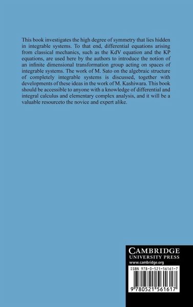 This book was first published in 1999 and investigates the high degree of symmetry that lies hidden in integrable systems. To that end, differential equations arising from classical mechanics, such as the KdV equation and the KP equations, are used here by the authors to introduce the notion of an infinite dimensional transformation group acting on spaces of integrable systems. The work of M. Sato on the algebraic structure of completely integrable systems is discussed, together with developments of these ideas in the work of M. Kashiwara. This book should be accessible to anyone with a knowledge of differential and integral calculus and elementary complex analysis, and it will be a valuable resource to the novice and expert alike.