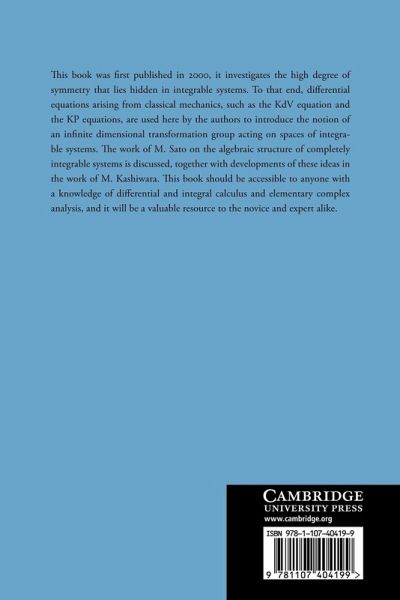 This book was first published in 1999 and investigates the high degree of symmetry that lies hidden in integrable systems. To that end, differential equations arising from classical mechanics, such as the KdV equation and the KP equations, are used here by the authors to introduce the notion of an infinite dimensional transformation group acting on spaces of integrable systems. The work of M. Sato on the algebraic structure of completely integrable systems is discussed, together with developments of these ideas in the work of M. Kashiwara. This book should be accessible to anyone with a knowledge of differential and integral calculus and elementary complex analysis, and it will be a valuable resource to the novice and expert alike.