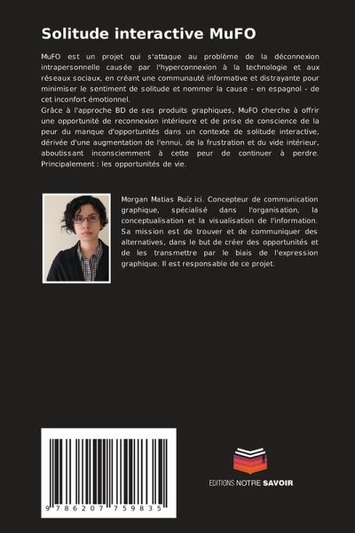 MuFO est un projet qui s'attaque au problème de la déconnexion intrapersonnelle causée par l'hyperconnexion à la technologie et aux réseaux sociaux, en créant une communauté informative et distrayante pour minimiser le sentiment de solitude et nommer la cause - en espagnol - de cet inconfort émotionnel.Grâce à l'approche BD de ses produits graphiques, MuFO cherche à offrir une opportunité de reconnexion intérieure et de prise de conscience de la peur du manque d'opportunités dans un contexte de solitude interactive, dérivée d'une augmentation de l'ennui, de la frustration et du vide intérieur, aboutissant inconsciemment à cette peur de continuer à perdre. Principalement : les opportunités de vie.