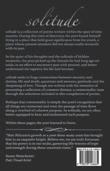 solitude is a collection of poems written within the span of nine months. During this time of discovery, the poet found himself living in a place that held great significance from his youth, a place whose present situation did not always easily reconcile with its past. In the quiet of his thoughts and the solitude of hidden moments, the poet picked up the threads he had long ago set aside, in an effort to reconnect past with present, and better understand the tapestry his life had become. solitude seeks to forge connections between ancestry and destiny, life and death, questions and answers, gratitude and the deepening of love. Though not written with the intention of presenting a collection of common themes, a commonality runs through the selections included in this compilation of poems. Perhaps that commonality is simply the poet's recognition that all things are connected and even the passage of time flows along a riverbed of cohesive purpose. In solitude, we are often better equipped to hear and understand such purpose. Within these pages, the poet learned to listen.