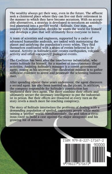 Early in the twenty-fifth century, agent Adrianne Atwood is on an assignment that is taking entirely too long. She's been tasked with gaining evidence to put Landro Jackson, a rich industrialist, behind bars. She knows where he is but figuring out what he's doing has become a complex puzzle. Engineers have terraformed a planet, called Solitude, as the ultimate retirement local for the wealthy. Adrianne discovers that Jackson is conspiring to acquire the planet for himself. Taking advantage of his immense wealth, he enlists the aid of Solitude employees to accomplish his reprehensible goal. Adrianne's cover, as the assistant to the planet's project manager, has become second nature and she sees no end to her real job. Helping her boss save the planet and its residents from Jackson's reckless plan begins overshadowing her mission. What appear to be natural disasters are revealed as the despicable results of Jackson's strategy. Adrianne's efforts at last generate the necessary evidence she needs. Jackson's arrest is imminent until the industrialist's mysterious death rips a successful mission from Adrianne's grasp.
