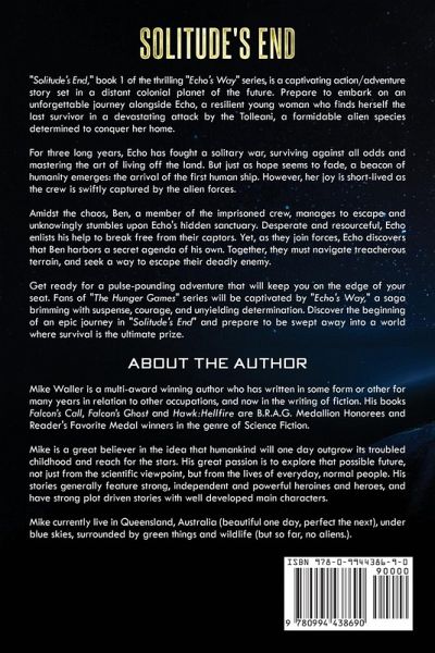 "Solitude's End," book 1 of the thrilling "Echo's Way" series, is a captivating action/adventure story set in a distant colonial planet of the future. Prepare to embark on an unforgettable journey alongside Echo, a resilient young woman who finds herself the last survivor in a devastating attack by the Tolleani, a formidable alien species determined to conquer her home. Echo has fought a solitary war for three long years, surviving against all odds and mastering the art of living off the land. But just as hope seems to fade, a beacon of humanity emerges: the arrival of the first human ship. However, her joy is short-lived as the alien forces swiftly capture the crew. Amidst the chaos, Ben, a member of the imprisoned crew, manages to escape and unknowingly stumbles upon Echo's hidden sanctuary. Desperate and resourceful, Echo enlists his help to break free from their captors. Yet, as they join forces, Echo discovers that Ben harbors his own secret agenda. Together, they must navigate treacherous terrain, and seek a way to escape their deadly enemy. Get ready for a pulse-pounding adventure that will keep you on the edge of your seat. Fans of "The Hunger Games" series will be captivated by "Echo's Way," a saga brimming with suspense, courage, and unyielding determination. Discover the beginning of an epic journey in "Solitude's End" and prepare to be swept away into a world where survival is the ultimate prize.