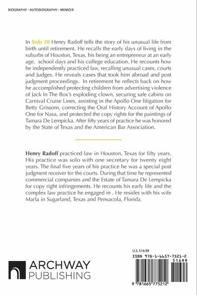 In Solo 50 Henry Radoff tells the story of his unusual life from birth until retirement. He recalls the early days of living in the suburbs of Houston, Texas, his being an entrepreneur at an early age, school days and his college education. He recounts how he independently practiced law, recalling unusual cases, courts and Judges. He reveals cases that took him abroad and post judgment proceedings. In retirement he reflects back on how he accomplished protecting children from advertising violence of Jack In The Box's exploding clown, securing safe cabins on Carnival Cruise Lines, assisting in the Apollo One litigation for Betty Grissom, correcting the Oral History Account of Apollo One for Nasa, and protected the copy rights for the paintings of Tamara De Lempicka. After fifty years of practice he was honored by the State of Texas and the American Bar Association.