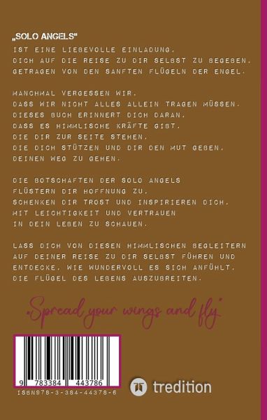 "Solo Angels: Mit himmlischer Leichtigkeit zu dir selbst" ist ein Buch voller inspirierender Botschaften, die dir helfen, inmitten der Herausforderungen des Alltags zu dir selbst zu finden. Jeder Engel im Buch steht für eine besondere Qualität - wie Mut, Vergebung, Liebe oder Frieden - und lädt dich ein, innezuhalten und Kraft aus diesen Eigenschaften zu schöpfen.Es ist ein Begleiter für Menschen, die sich nach mehr Achtsamkeit, Selbstliebe und spiritueller Tiefe sehnen. Mit kurzen, berührenden Texten und sanften Illustrationen bietet "Solo Angels" Impulse, die Herzen öffnen und Wege zur inneren Heilung aufzeigen.Dieses Buch richtet sich an Menschen, die sich nach innerem Frieden, Selbstliebe und Inspiration sehnen. Es ist ideal für:-Suchende: Menschen, die auf der Reise zu sich selbst sind und inmitten der Hektik des Alltags nach Ruhe und Klarheit suchen.-Spirituell Interessierte: Leserinnen und Leser, die sich für Achtsamkeit, persönliche Weiterentwicklung und die Verbindung zwischen Körper, Geist und Seele begeistern.-Menschen in Veränderung: Alle, die sich in einer Phase der Neuorientierung oder des Umbruchs befinden und sich nach sanften Impulsen für ihren Weg suchen.-Kreative Seelen: Menschen, die Inspiration in kurzen, tiefgehenden Texten und sanften Illustrationen finden möchten.-Empfindsame Menschen: Leser, die ihre Gefühle und Gedanken oft intensiv erleben und auf der Suche nach Mut, Trost oder Stärke sind."Solo Angels" ist für alle, die sich von den Botschaften der Engel berühren lassen möchten, um mehr Leichtigkeit, Vertrauen und Freude in ihr Leben zu bringen.
