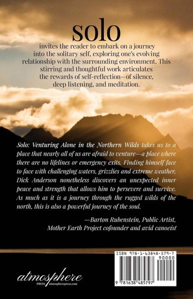 Solo invites the reader to embark on a journey into the solitary self, exploring one's evolving relationship with the surrounding environment. This stirring and thoughtful work articulates the rewards of self-reflection, and of silence, deep listening, and meditation. --- Solo: Venturing Alone in the Northern Wilds takes us to a place that nearly all of us are afraid to venture-a place where there are no lifelines or emergency exits. Finding himself face to face with challenging waters, grizzlies and extreme weather, Dick Anderson nonetheless discovers an unexpected inner peace and strength that allows him to persevere and survive. As much as it is a journey through the rugged wilds of the north, this is also a powerful journey of the soul. -Barton Rubenstein, Public Artist, Mother Earth Project cofounder and avid canoeist
