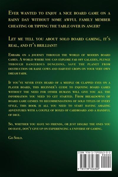 Ever wanted to enjoy a nice board game on a rainy day without some awful family member cheating or tipping the table over in anger? Let me tell you all about solo board gaming, it's real, and it's brilliant! Embark on a journey through the world of modern board games. A world where you can explore far off galaxies, plunge through dangerous dungeons, save the planet from destruction or raise cows and harvest crops on your very own dream farm. If you've never even heard of a meeple or clapped eyes on a player board, this beginner's guide to enjoying board games without the need for other humans will give you all the information you need to get started. From breakdowns of board game genres to recommendations of solo titles of every style, this book is all you need to start having amazing adventures with a couple boxes of cardboard and a handful of dice. So, whether you have no friends, or just dislike the ones you do have, don't give up on experiencing a universe of gaming. Go Solo.