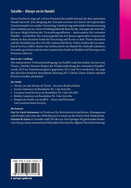 Dieses Fachbuch zeigt auf, welches Potenzial das mobile Internet für den stationären Handel darstellt. Das Shopping der Zukunft zeichnet sich durch ein begleitendes Zusammenspiel von sozialer Vernetzung, Lokalisierung und mobiler Internetnutzung beim Ladenbesuch aus. Dieser Dreiklang bildet die Basis für die "Synergien des SoLoMo", die neue Möglichkeiten der Vermarktungseffizienz - insbesondere für stationäre Händler - erschließen. Die Autoren greifen die sich daraus ergebenden Chancen auf, indem sie den aktuellen Stand der Forschung und Praxis zu dem Thema darstellen und die Basisfaktoren des SoLoMo umfassend klären. Dabei werden die Location-based Services (LBS), denen eine Schlüsselrolle im Handel der Zukunft zukommt, besonders gewichtet und mit einer empirischen Studie in Hinblick auf Nutzung sowie Potenzial erforscht.