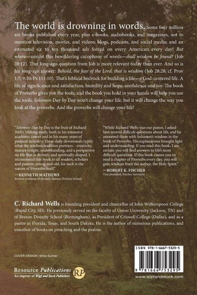 The world is drowning in words. Some four million are books published every year, plus e-books, audiobooks, and magazines, not to mention television, movies, and videos; blogs, podcasts, and social media; and an estimated six to ten thousand ads forced on every American every day! But where--amidst this bewildering cacophony of words--shall wisdom be found? (Job 28:12). That long-ago question from Job is more relevant today than ever. And so is his long-ago answer: Behold, the fear of the Lord, that is wisdom (Job 28:28; cf. Prov 1:7; 9:10; Ps 111:10). That's biblical bedrock for building a life--a God-centered life. A life of significance and satisfaction, humility and hope, confidence and joy. The book of Proverbs gives you the tools, and the book you hold in your hands will help you use the tools. Solomon Day by Day won't change your life, but it will change the way you look at the proverbs. And the proverbs will change your life!