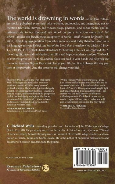 The world is drowning in words. Some four million are books published every year, plus e-books, audiobooks, and magazines, not to mention television, movies, and videos; blogs, podcasts, and social media; and an estimated six to ten thousand ads forced on every American every day! But where--amidst this bewildering cacophony of words--shall wisdom be found? (Job 28:12). That long-ago question from Job is more relevant today than ever. And so is his long-ago answer: Behold, the fear of the Lord, that is wisdom (Job 28:28; cf. Prov 1:7; 9:10; Ps 111:10). That's biblical bedrock for building a life--a God-centered life. A life of significance and satisfaction, humility and hope, confidence and joy. The book of Proverbs gives you the tools, and the book you hold in your hands will help you use the tools. Solomon Day by Day won't change your life, but it will change the way you look at the proverbs. And the proverbs will change your life!