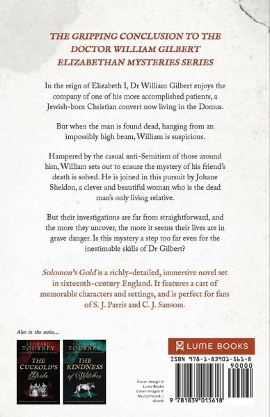 MEET DR WILLIAM GILBERT IN THIS ENTHRALLING ELIZABETHAN HISTORICAL MYSTERY. 16th Century England. Dr William Gilbert enjoys the company of one of his more accomplished patients, a Jewish-born Christian convert now living in the Domus. But when the man is found dead, hanging from an impossibly high beam, William is suspicious. Hampered by the prejudice of those around him, William sets out to ensure the mystery of his friend's death is solved. He is joined in this pursuit by Johane Sheldon, a clever and beautiful woman who is the dead man's only living relative. Is this mystery a step too far even for the inestimable skills of Dr Gilbert? Perfect for fans of C.J. Sansom, Iain Pears, S.W. Perry, Andrew Taylor, S.G. MacLean, Ian Morson, and David Penny. PRAISE FOR LEONARD TOURNEY: ¿¿¿¿¿ 'A fascinating look into another era.' Robyn B. ¿¿¿¿¿ 'This series is a delight and not to be missed.' Steve H. ¿¿¿¿¿ 'Brilliant book, couldn't put it down. One to re-read.' Anne R. WILLIAM GILBERT MYSTERIES BOOK 1: THE CUCKOLD'S BRIDE BOOK 2 THE KINDNESS OF WITCHES BOOK 3: SOLOMON'S GOLD