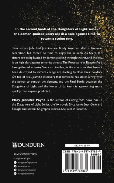 In the second book of the Daughters of Light series, the demon-hunted Seers are in a race against time to return a stolen ring. Twin sisters Jade and Jasmine are finally together after a five-year separation, but there's no time to enjoy the reunion. As Seers, the sisters are being hunted by demons spilling through the rift, and the city is on high alert against terrorist threats. The Protectors at Beaconsfield have gathered as many Seers as possible, as the countries that haven't been destroyed by climate change are starting to close their borders. On top of it all, Jasmine discovers that someone has stolen a ring with the power to control the demons, and the Final Battle between the Daughters of Light and the forces of darkness is approaching more quickly than anyone predicted.