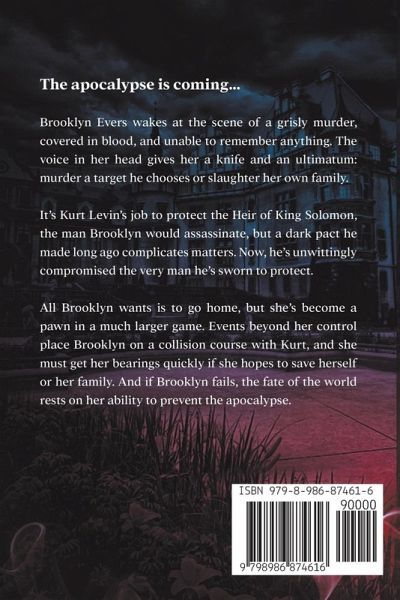 The apocalypse is coming… Brooklyn Evers wakes at the scene of a grisly murder, covered in blood, and unable to remember anything. The voice in her head gives her a knife and an ultimatum: murder a target he chooses or slaughter her own family. It's Kurt Levin's job to protect the Heir of King Solomon, the man Brooklyn would murder, but a dark pact he made long ago complicates matters. Now, he's unwittingly compromised the very man he's sworn to protect. All Brooklyn wants is to go home, but she's become a pawn in a much larger game. Events beyond her control place Brooklyn on a collision course with Kurt, and she must get her bearings quickly if she hopes to save herself or her family. And if Brooklyn fails, the fate of the world rests on her ability to prevent the apocalypse.
