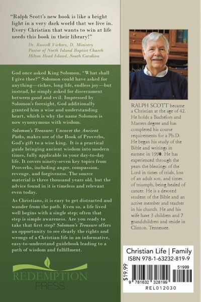 God once asked King Solomon, "What shall I give thee?" Solomon could have asked for anything-riches, long life, endless joy-but instead, he simply asked for discernment between good and evil. Impressed by Solomon's foresight, God additionally granted him a wise and understanding heart, which is why the name Solomon is now synonymous with wisdom. "Solomon's Treasure: Uncover the Ancient Paths," makes use of the Book of Proverbs, God's gift to a wise king. It is a practical guide bringing ancient wisdom into modern times, fully applicable in your day-to-day life. It covers ninety-seven key topics from Proverbs, including anger, compassion, revenge, and forgiveness. The source material is three thousand years old, but the advice found in it is timeless and relevant even today. As Christians, it is easy to get distracted and wander from the path. Even so, a life lived well begins with a single step; often that step is simple awareness. Are you ready to take that first step? "Solomon's Treasure" offers an opportunity to see clearly the rights and wrongs of a Christian life in an informative, easy-to-understand guidebook leading to a path of wisdom and fulfillment.