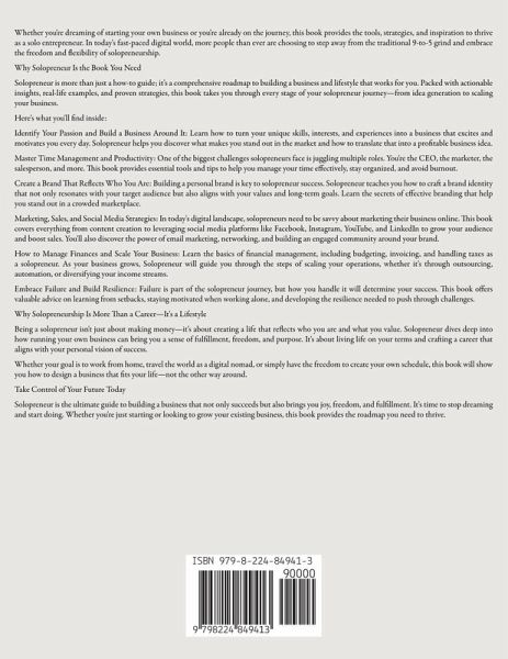 Whether you're dreaming of starting your own business or you're already on the journey, this book provides the tools, strategies, and inspiration to thrive as a solo entrepreneur. In today's fast-paced digital world, more people than ever are choosing to step away from the traditional 9-to-5 grind and embrace the freedom and flexibility of solopreneurship. Why Solopreneur Is the Book You Need Solopreneur is more than just a how-to guide; it's a comprehensive roadmap to building a business and lifestyle that works for you. Packed with actionable insights, real-life examples, and proven strategies, this book takes you through every stage of your solopreneur journey-from idea generation to scaling your business. Here's what you'll find inside: Identify Your Passion and Build a Business Around It: Learn how to turn your unique skills, interests, and experiences into a business that excites and motivates you every day. Solopreneur helps you discover what makes you stand out in the market and how to translate that into a profitable business idea. Master Time Management and Productivity: One of the biggest challenges solopreneurs face is juggling multiple roles. You're the CEO, the marketer, the salesperson, and more. This book provides essential tools and tips to help you manage your time effectively, stay organized, and avoid burnout. Create a Brand That Reflects Who You Are: Building a personal brand is key to solopreneur success. Solopreneur teaches you how to craft a brand identity that not only resonates with your target audience but also aligns with your values and long-term goals. Learn the secrets of effective branding that help you stand out in a crowded marketplace. Marketing, Sales, and Social Media Strategies: In today's digital landscape, solopreneurs need to be savvy about marketing their business online. This book covers everything from content creation to leveraging social media platforms like Facebook, Instagram, YouTube, and LinkedIn to grow your audience and boost sales. You'll also discover the power of email marketing, networking, and building an engaged community around your brand. How to Manage Finances and Scale Your Business: Learn the basics of financial management, including budgeting, invoicing, and handling taxes as a solopreneur. As your business grows, Solopreneur will guide you through the steps of scaling your operations, whether it's through outsourcing, automation, or diversifying your income streams. Embrace Failure and Build Resilience: Failure is part of the solopreneur journey, but how you handle it will determine your success. This book offers valuable advice on learning from setbacks, staying motivated when working alone, and developing the resilience needed to push through challenges. Why Solopreneurship Is More Than a Career-It's a Lifestyle Being a solopreneur isn't just about making money-it's about creating a life that reflects who you are and what you value. Solopreneur dives deep into how running your own business can bring you a sense of fulfillment, freedom, and purpose. It's about living life on your terms and crafting a career that aligns with your personal vision of success. Whether your goal is to work from home, travel the world as a digital nomad, or simply have the freedom to create your own schedule, this book will show you how to design a business that fits your life-not the other way around. Take Control of Your Future Today Solopreneur is the ultimate guide to building a business that not only succeeds but also brings you joy, freedom, and fulfillment. It's time to stop dreaming and start doing. Whether you're just starting or looking to grow your existing business, this book provides the roadmap you need to thrive.