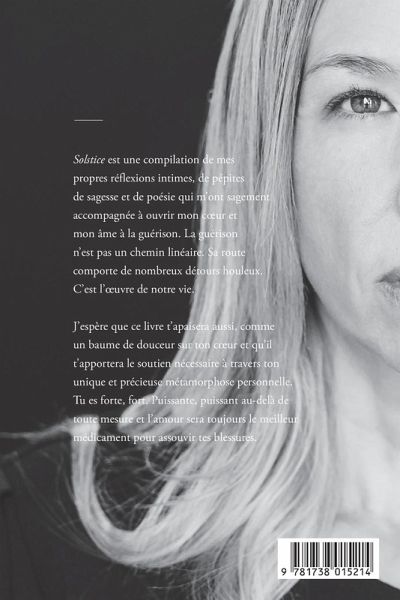 En mars 2022, on m'a diagnostiqué un cancer de la glande thyroïde. Le grand C. Ce fut une expérience brute, intense, chaotique, mais largement puissante et transformatrice. Dans le brouillard de ma colère, de ma tristesse et de mes peurs, j'ai délicatement été guidée à écrire mes nombreux états d'âmes et poèmes lorsque j'en étais inspirée. Jamais je n'aurais cru que mon premier livre verrait le jour, des suites de ce périple. Solstice est une compilation de mes propres réflexions intimes, de pépites de sagesse et de poésie qui m'ont sagement accompagnée à ouvrir mon cur et mon âme à la guérison. Ce fût un merveilleux exutoire personnel, me permettant d'accueillir la possibilité de me reconnecter et d'incarner pleinement cet amour et cette compassion absolus pour moi-même. L'écriture de ce livre m'a également épaulée à trouver réconfort, paix et bonheur dans cette saison chaotique de ma vie, et j'en suis très reconnaissante. La traversée n'est pas terminée. La guérison n'est pas un chemin linéaire. Sa route comporte de nombreux détours houleux. C'est l'uvre de notre vie. J'ai confiance avec certitude que cette expérience me servira d'importantes leçons, et me redirigera sur la bonne voie et ce, pour mon plus grand bien et ma croissance. Un jour à la fois, j'apprends à laisser aller ce qui n'est plus en alignement avec mon âme et de faire place à l'amour, la joie, l'abondance et la créativité dans ma vie de tous les jours. J'espère que Solstice t'apaisera aussi, comme un baume de douceur sur ton cur et qu'il t'apportera le soutien nécessaire à travers ton unique et précieuse métamorphose personnelle. N'oublie jamais que tu es toujours aimé et supporté, peu importe ce que tu traverseras, d'un bout à l'autre de ta merveilleuse aventure sur terre. Je te vois. Je t'entends. Je t'aime. Inconditionnellement. Tanya xx