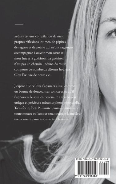 En mars 2022, on m'a diagnostiqué un cancer de la glande thyroïde. Le grand C. Ce fut une expérience brute, intense, chaotique, mais largement puissante et transformatrice. Dans le brouillard de ma colère, de ma tristesse et de mes peurs, j'ai délicatement été guidée à écrire mes nombreux états d'âmes et poèmes lorsque j'en étais inspirée. Jamais je n'aurais cru que mon premier livre verrait le jour, des suites de ce périple. Solstice est une compilation de mes propres réflexions intimes, de pépites de sagesse et de poésie qui m'ont sagement accompagnée à ouvrir mon cur et mon âme à la guérison. Ce fût un merveilleux exutoire personnel, me permettant d'accueillir la possibilité de me reconnecter et d'incarner pleinement cet amour et cette compassion absolus pour moi-même. L'écriture de ce livre m'a également épaulée à trouver réconfort, paix et bonheur dans cette saison chaotique de ma vie, et j'en suis très reconnaissante. La traversée n'est pas terminée. La guérison n'est pas un chemin linéaire. Sa route comporte de nombreux détours houleux. C'est l'uvre de notre vie. J'ai confiance avec certitude que cette expérience me servira d'importantes leçons, et me redirigera sur la bonne voie et ce, pour mon plus grand bien et ma croissance. Un jour à la fois, j'apprends à laisser aller ce qui n'est plus en alignement avec mon âme et de faire place à l'amour, la joie, l'abondance et la créativité dans ma vie de tous les jours. J'espère que Solstice t'apaisera aussi, comme un baume de douceur sur ton cur et qu'il t'apportera le soutien nécessaire à travers ton unique et précieuse métamorphose personnelle. N'oublie jamais que tu es toujours aimé et supporté, peu importe ce que tu traverseras, d'un bout à l'autre de ta merveilleuse aventure sur terre. Je te vois. Je t'entends. Je t'aime. Inconditionnellement. Tanya xx