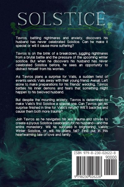 Tavros, battling nightmares and anxiety, discovers his husband has never celebrated Solstice. Can he make it special or will it cause more suffering? Tavros is on the brink of a breakdown, juggling nightmares from a brutal battle and the pressure of the upcoming winter solstice. But when he discovers his husband has never celebrated Solstice before, he sees an opportunity to distract himself from his worries. As Tavros plans a surprise for Valis, a sudden twist of events sends Valis away with their young friend, Aenali. Left alone to make preparations for his friends' wedding, Tavros battles his inner demons and fears that something might happen to his beloved husband. But despite the mounting anxiety, Tavros is determined to make Valis's first Solstice a special one. Can Tavros get his surprise finished in time for Valis's return? Will it backfire and cause them both more trauma? Join Tavros as he navigates his war trauma and strives to create a joyous Solstice celebration for his husband-and the entire monastery. Will he succeed in brightening Valis's Winter Solstice, or will his plans fail? Find out in this heartwarming tale of love and family.Solstice is mostly a fluffy, Christmassy read and deals with what these characters call War Trauma. PTSD is serious and debilitating, and Devon did their best to treat it respectfully. This is the final installment of The God Jars Saga. I hope it fills you with the warmth and love that forever burns between these two amazing guys and their gaggle of friends and found family. Tags:Tavros finally gets a POV!, Tavros has anxiety almost as bad as when Valis first came to Avristin, getting kids involved in decorating is precious and adorable and melts everyone into goo, Winter Solstice has never been like this before, Valis and Aenali are plotting against Jedai and Maphias, Tavros's entire life's mission is to decorate the entire monastery for his husband, he just doesn't know how to do it in two days!, war trauma is hard, Tavros is a good boy and goes to therapy, schmoop galore